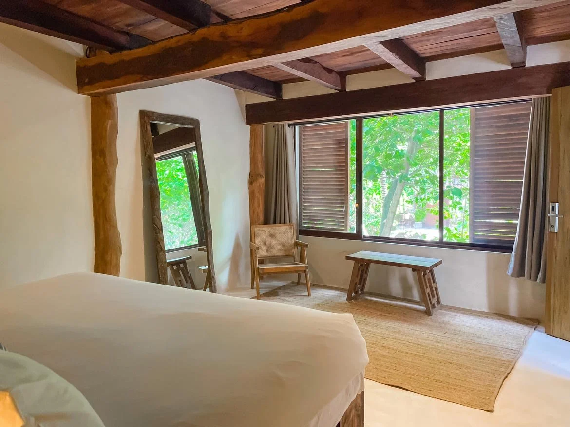 A large room set up to share. Each person has their own little space while sharing a large room with 2 other yogis. Rooms do not have a beach view and are slightly back in the property, but are comfortable and nice.
